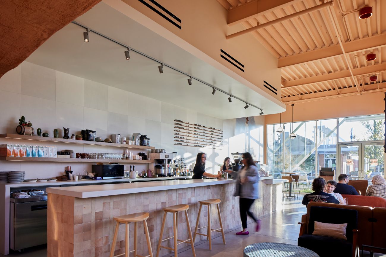 Escape to the high desert in this coffee shop inspired by the Southwest. With New Mexican roots on both the owner and design team, an authentic Southwest outpost took shape. Through the use of warm natural tones, simple materials, and a stunning ceiling “cliff,” the design team crafted a space that is reverential of its inspiration while inviting patrons to nestle in.